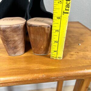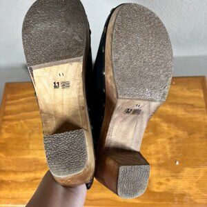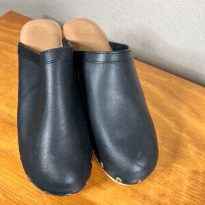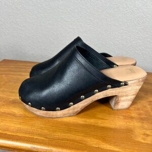 Beautiful leather Beek clogs with wooden heels. Rubber on the soul for grip.