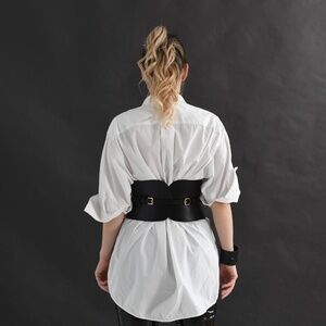 For smaller waists (28-30) this belt will be fully closed like a corset. For slightly larger waists (31-32) the belt might be slightly apart connected by the belt ribbon and a buckle.