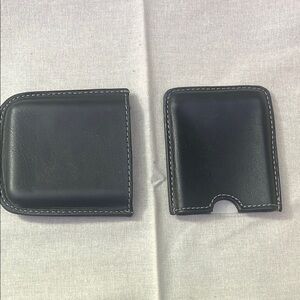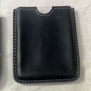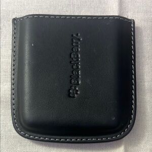 Sleek black leather pouch set for Blackberry. The Blackberry case measures 3”x3” and the matching card case measures approximately 2.5”x3”. Perfect for protecting your device and credit cards.