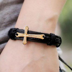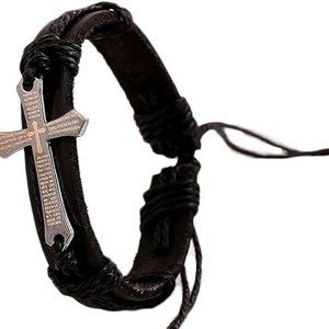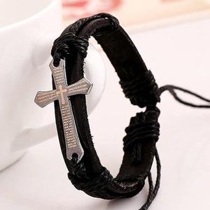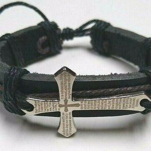 Black Leather Bracelet with Cross, Lords Prayer, Christian God, Jesus, Catholic