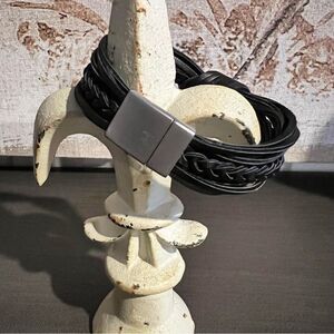 Black Leather Braided Bracelet with Silver Magnetic Clasp