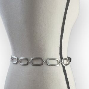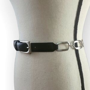 Black leather belt with brushed nickel silvertone chain links.