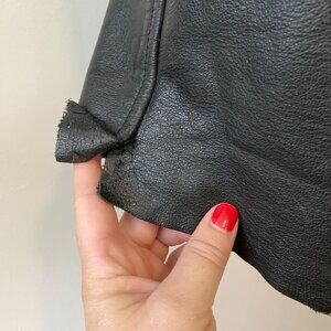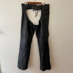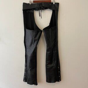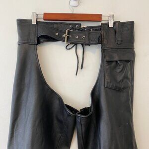 Black genuine leather chaps with zip and snap closures. Overall good condition but missing one snap at bottom. Raw edges at bottom