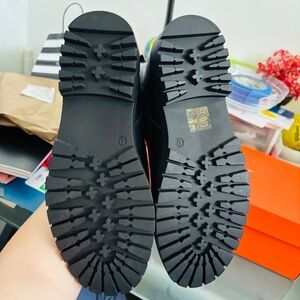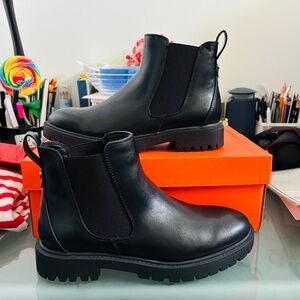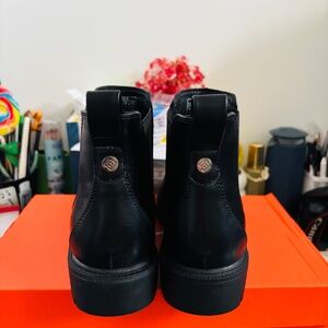 A pair of sleek black leather Chelsea boots with chunky ridged soles. The boots have elastic side panels and pull tabs at the back for easy wearing.