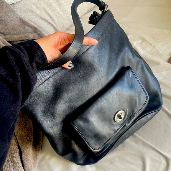 This is in great condition, not used very much. Black leather bucket bag by Coach!