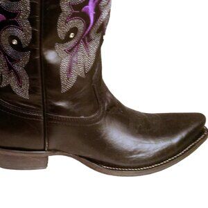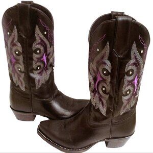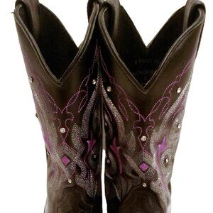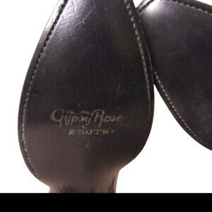 A pair of Gypsy Rose Black Leather Cowgirl Boots are listed for sale. The boots are Black and Silver with Purple Stitching and Rhinestones and features a Leather Upper and Leather Outsole. The Boots are in excellent condition. Never worn outside.