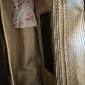 Beautiful black leather crossbody, suitable for a dressy night out, or a day in the office. It is 6 inches by 8 inches with a generous 2 and 3/4 inch gusset. This bag has a stylish gold chain and leather strap. It has never been used and has been lovingly stored in a non-smoking household. This bag has a zippered interior pocket and another pocket on the opposite side of the interior. It is fully lined with a light tan satin.