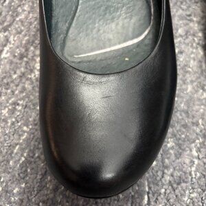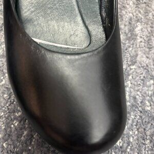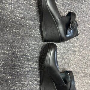 Dansko Rebel Leather Ankle Strap Mary Jane Wedge Heels Shoes SZ 38 Black Retro. Stylish Mary Jane style shoe with adjustable buckle closure and elastic gusset in back. Made with high-quality, burnished Nappa leather. Leather insoles.Heel height: approx. 2.75"Excellent condition with very minor wear, primarily a few faint scuffs.EU 39.