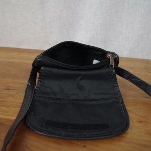 This listing is for a Colombian Made Black Fanny Pack. It is made of black leather with a slightly waxy finish, zipper and velcro pocket closure and a wide range of adjustability.