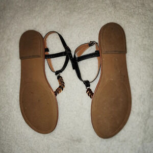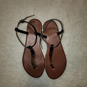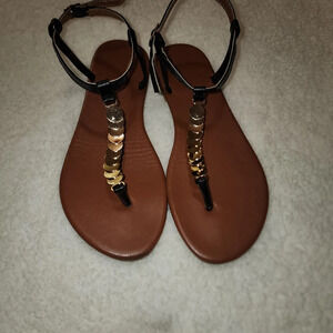 Gorgeous summer sandals in black with gold discs! These are size 8 and like new. {I wore for maybe an hour but my feet were too wide for these.} These are SUPER adjustable with the ankle straps having 3 different adjustment points. These offer a timeless look from simplicity of flat black sandals with an added touch of glamour.