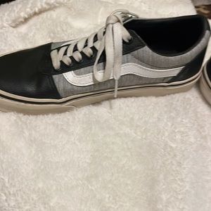 Size 7 Men’s Vans sneakers. Great condition. Black leather, gray cloth and white stripes