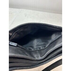 The unbranded bag features zippered pockets and a zip closure to keep your items secure. The black leather exterior and lining are both durable and sleek, making the bag look luxurious. The leather handle/strap adds to the elegance of the bag. It is perfect for women who want a chic and functional accessory.