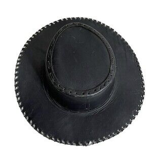 A classic style hat that is a little bit outback a little bit south western, lends itself to many different outfit styles. There is no tag or information of any kind on the hat. It is a good quality, heavy weight leather stitched with leather cord. Silver toned lacing around the edges has some minor wear at the edges. It’s quite clean with no major flaws. I wear a hat Size 7 1/8 and it fits me quite well. Approx measurements, 22” around inside, 23” around the outside, 3” brim, 4” brim to crown. The original owner was a woman but I see no reason why this would not work for a man.
