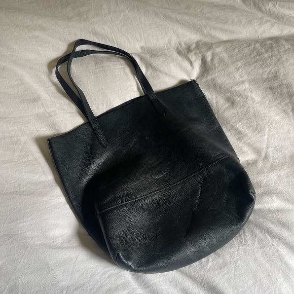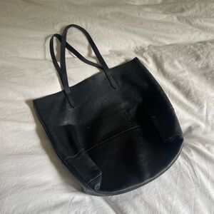 Black leather tote bag, a couple scratches that might be able to be buffed out (pictured), but I was lazy. No huge damages or rips though.