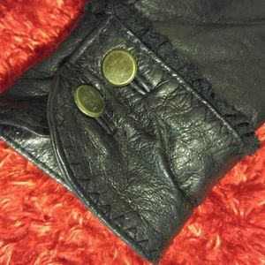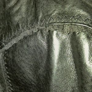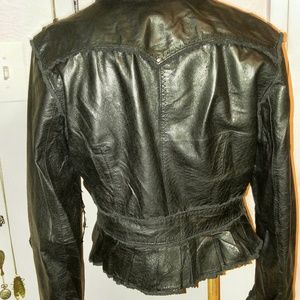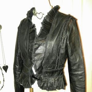 Black leather ruffles with tiny black lace trim. Very feminine combination of Leather and Lace.