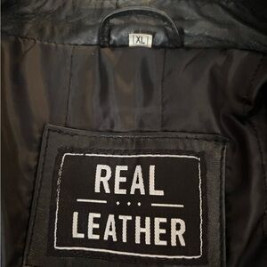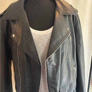 Stylish black leather jacket. Features silver zippers. Perfect for a chic look.