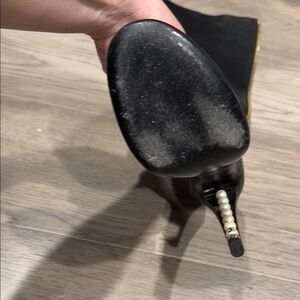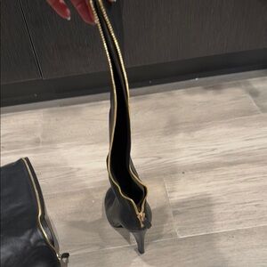 Step out in style with these elegant black leather knee-high boots. Featuring chic gold accents, they offer a sophisticated touch to any outfit.