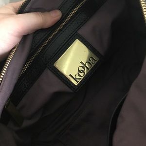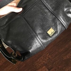 Sleek leather handbag with adjustable shoulder strap. Lots of little compartments for storing cash, lipgloss, and other knick knacks. Gold hardware. Hardly used, however you can see on the very last photo there are a few marks from the cat. Hardly noticeable though since it's a black bag.