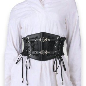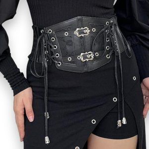 Black Leather Lace Silver Buckle Straps Lace Up Sides Wide Corset Belt NEW