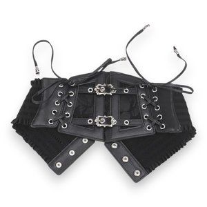 Black leather with lace accented panels wide corset belt! Featuring silver buckles, and hardware, adjustable lace-up side panels, comfy elastane back panel secure snap closure. Figure flattering, wide statement belt! Vintage gothic to romantic bohemain!