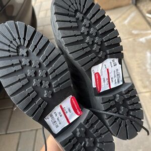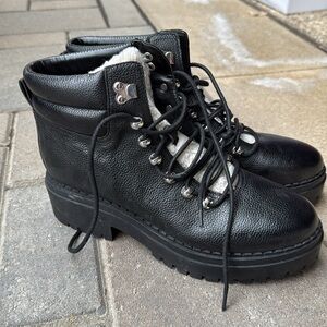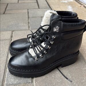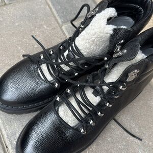 Stylish black leather boots with lace-up design and cozy shearling lining. Perfect for a chic and warm look.