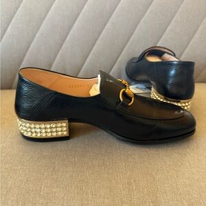 ✨ Stunning Gucci loafers crafted in black leather, detailed with brushed gold horsebit hardware, and finished with a crystal-embellished block heel for a glamorous touch.