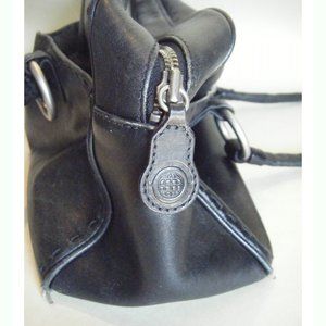 Gorgeous black leather Max Studio purse. Shoulder strap with silver tone metal ring detail. Black on black stitching detail. Zipper closure with snap on one end. Two side pockets with magnetic closure. Roomy interior with inside zipper pocket. There is some general distressing to this bag. Also, there are areas where the piping has come loose and needs to be repaired (by buyer). Please refer to photos. Otherwise, this is a hip and stylish purse. Priced accordingly. Price firm. Thanks!