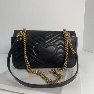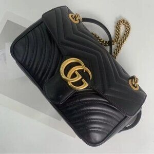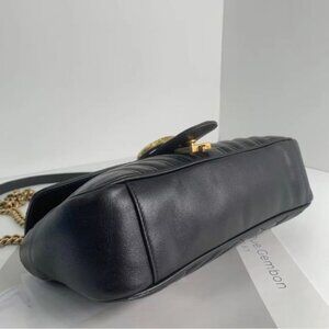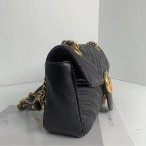 Adorn yourself with this elegant black leather mini bag, adorned with a delicate gold chain and the iconic GG logo, embodying refined taste and modern luxury.