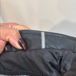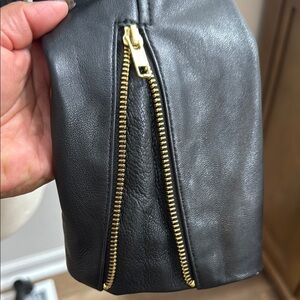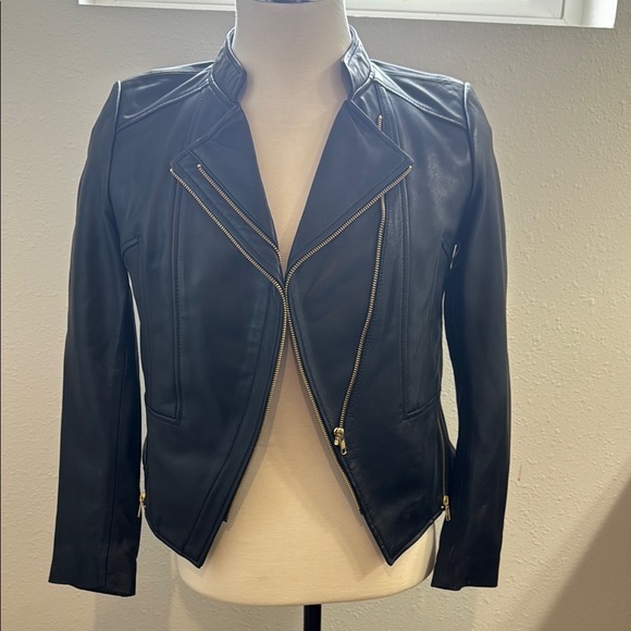 This sleek black leather jacket features a classic motorcycle design with an asymmetrical front zipper and a notched lapel collar. Its fitted silhouette and cropped length offer a modern edge, while the smooth leather material provides a subtle sheen for a sophisticated finish.