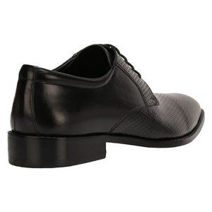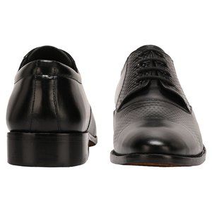 These black leather oxford shoes feature a polished upper with elegant broguing and a traditional lace-up closure. The rounded toe cap and low-profile heel offer a sleek silhouette, perfect for formal occasions. The subtle shine of the leather adds a touch of sophistication, making them ideal for pairing with suits and business attire.