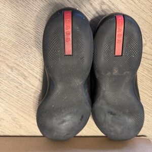 Rarely worn pair of black leather Prada rubber soled loafers. These loafers do not have a heel so are flat bottomed. The Prada size 6.5 wears like a 9.5 Nike gym shoe. Condition is good - wear on the front of the soles but the sole patter still in tact on the rear.