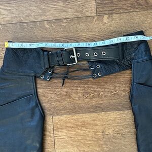 Excellent condition Like New black leather riding chaps for women. Like new. No tears, holes, stains, marks, scratches. Zippers works easily. Nice sturdy thick leather. Perfect for bikers. Nothing wrong with them. Didn’t fit. Never worn. Fits up to a 34” waist. Easily adjustable for a smaller waist.