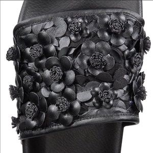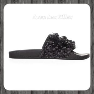 Avec Les Filles slide sandals. Pretty 3D Flowers across wide strap