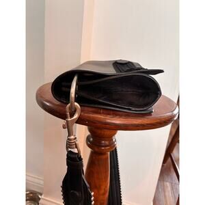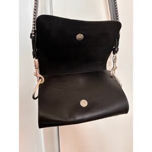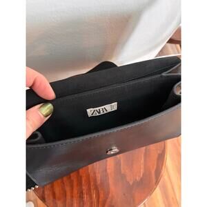 Black Leather Zara crossbody/shoulder purse with flap button details on front. Has thick leather removable strap with studs and stitching detail. Silver hardware. Some minor wear otherwise great condition! Purse measures 9x6 and strap is 31 inches long.