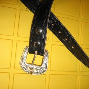 Black Leather Tooled Belt 1.5" x 46" 12 ga Conchos & Ornate Silver Buckle