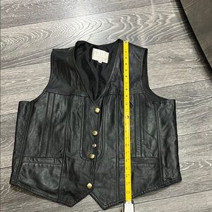 Sleek black leather vest with striking gold buttons. Ideal for adding a touch of elegance.