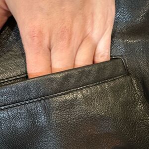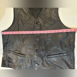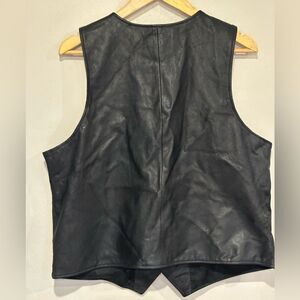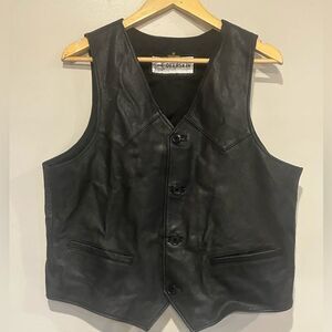 This sleek black leather vest showcases a classic V-neck design and a fitted silhouette, making it a versatile addition to any wardrobe. Its smooth leather material and timeless style ensure it complements both casual and semi-formal occasions effortlessly.