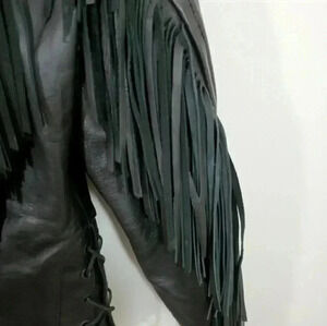 Stand out in this gorgeous black leather western-style jacket featuring long fringe detailing across the chest and back, plus bold purple rose embroidery for a unique, feminine touch. This zip-up cowgirl jacket blends edgy biker vibes with boho-chic style, perfect for concerts, festivals, rodeos, or everyday statement wear.