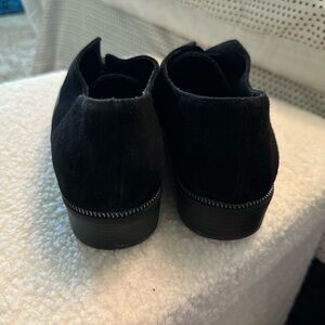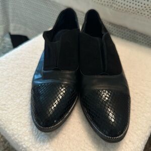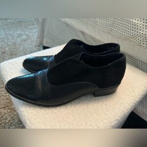 These black leather shoes blend multiple textures for a sophisticated look. The front features a glossy, reptile-patterned leather that adds a touch of elegance. The middle section transitions into smooth black leather, while the back and upper parts are crafted from rich black suede, creating a stylish contrast. With a low heel and sleek design, they’re perfect for both formal and semi-formal occasions.
