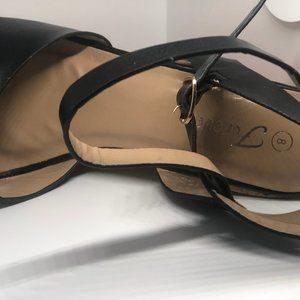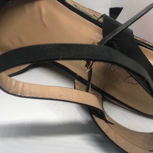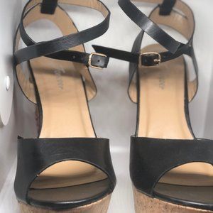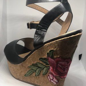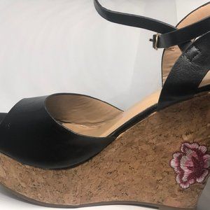 Black Leather strap Flower Embroidery Print Cork Wedge Like New
