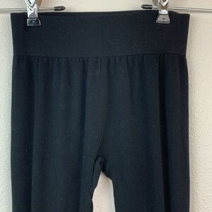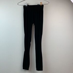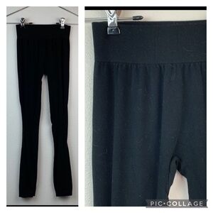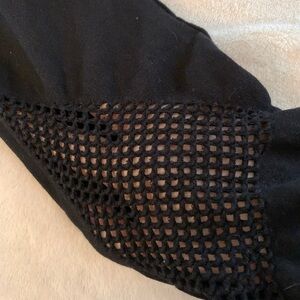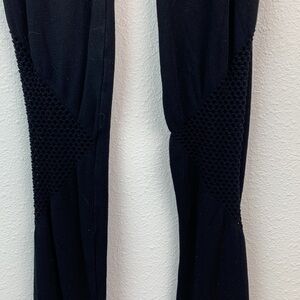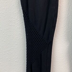 Black leggings with triangle crochet style fish net detail on outside of each leg, soft stretchy high waist. In excellent condition. No tag but compare the measurements to a pair you own.