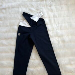 Sleek black leggings featuring a contrasting white waistband. Perfect for casual wear or workouts.