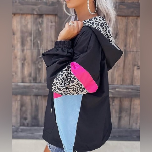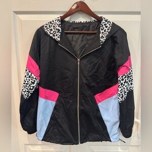 Black Leopard Color Block Full Zip Hooded Jacket women’s Size Medium