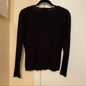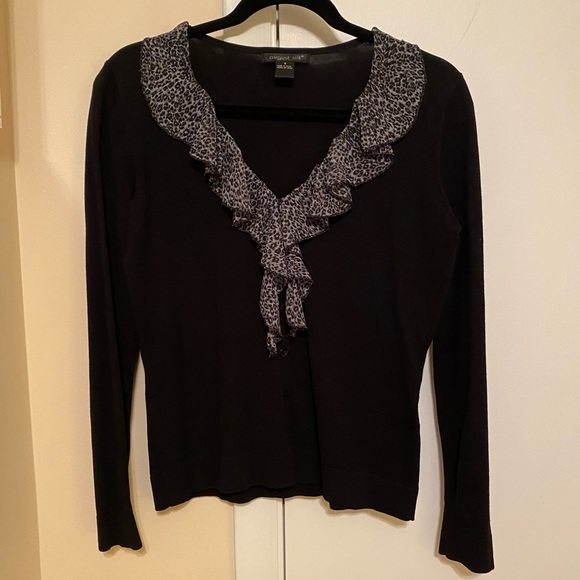 Cozy, light-weight cardigan with a snazzy leopard print ruffle along the neckline. Lightly worn, just slightly smashed-looking and lint-covered from storage. Silk ruffle with viscose and nylon cardigan.