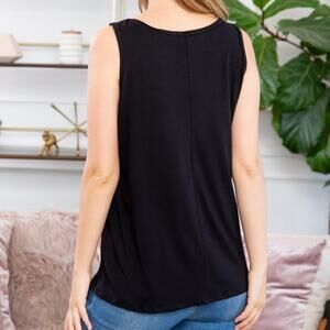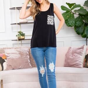 Black tank top with a cute leopard contrast pocket. Beautiful soft and slinky material. Breathable and perfect for a warmer day. Looks so cute with jeans or a pair of shorts.