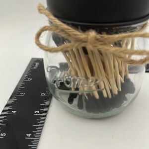 Small Mason Jar with black lid and approximately 100 black tipped double sided bio-degradable cotton buds inside. Decorative twine tied around the jar. Front of jar says “Home” and back of jar has an image of little fruit/veggies. Never used.