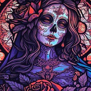 Neon Day of the Dead Sugar Skull Girl with Roses Church Window Style