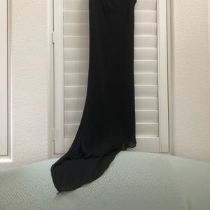 Black Lily v-neck scoop neck with side long train dress in size L. Black lining with sheer black fabric layered on top. Spaghetti straps. This dress has a small hole in the side train (barely noticeable due to dark color and fabric draping in train).