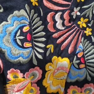 Unbranded black pants FEATURE a colorful floral embroidery motif on the bottom hem. Elastic banded waistband. High waist. Straight leg.