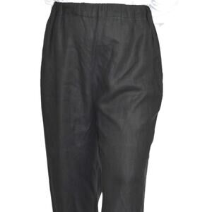 Black Linen Pant Embroidery Border Hem Floral Elastic High Waist Straight Medium